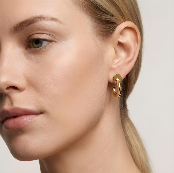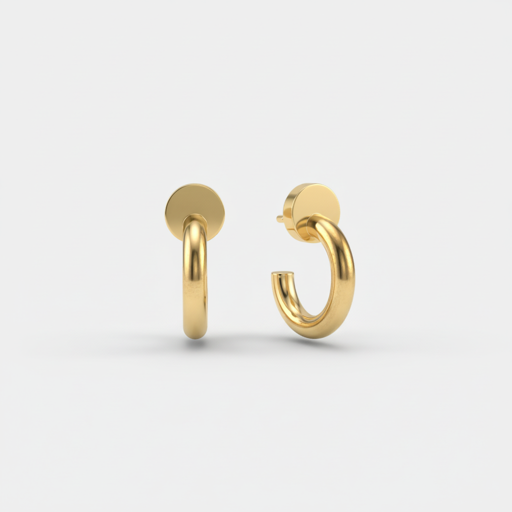 העגילים עשויים זהב 14K ומעוצבים כחישוק פתוח בעל נפח רך ונוכחות אלגנטית. החיבור לדיסק העגול יוצר מראה פיסולי ומדויק, שמוסיף תחושת יציבות, שקט ואיזון למבנה כולו.