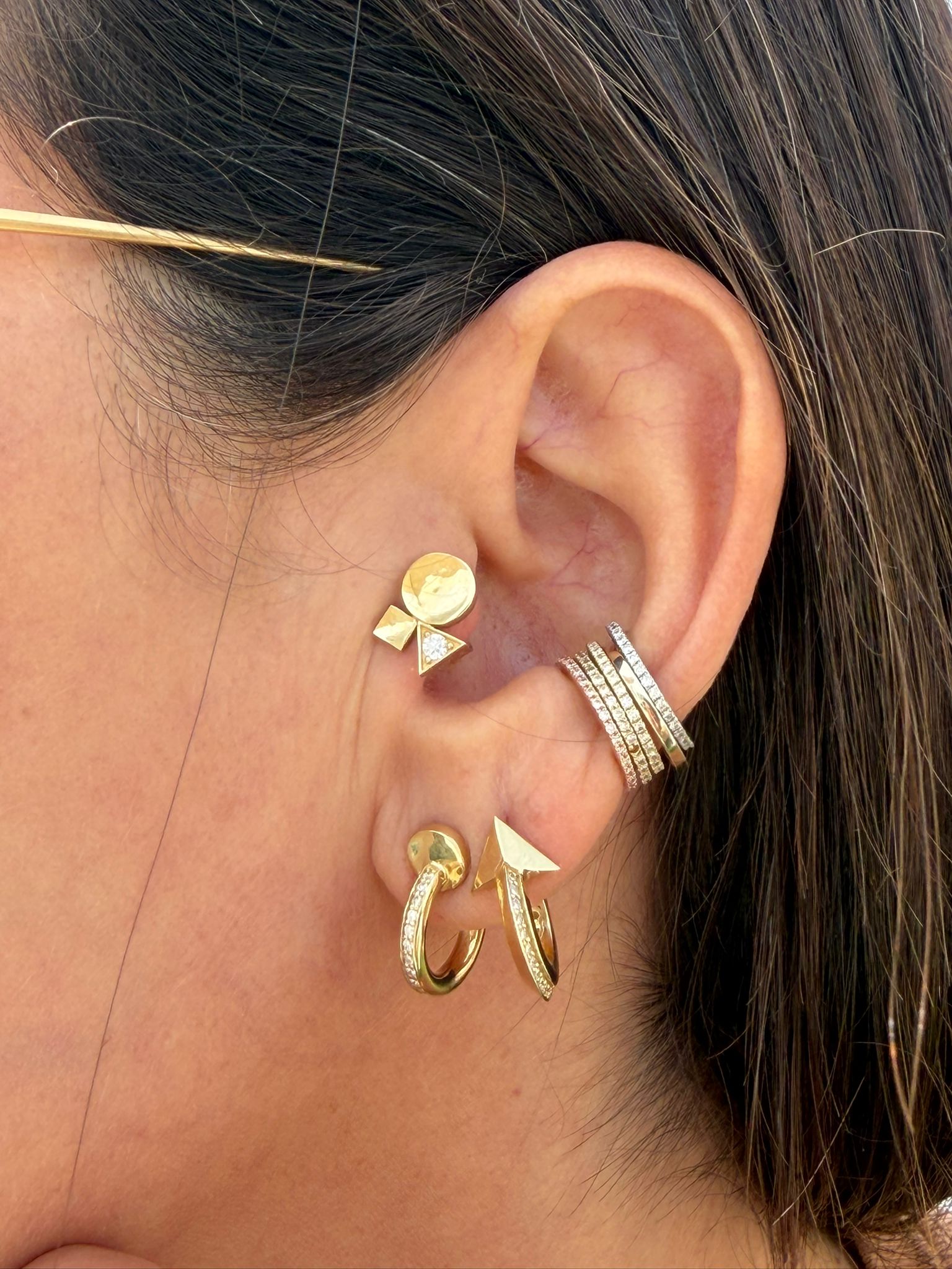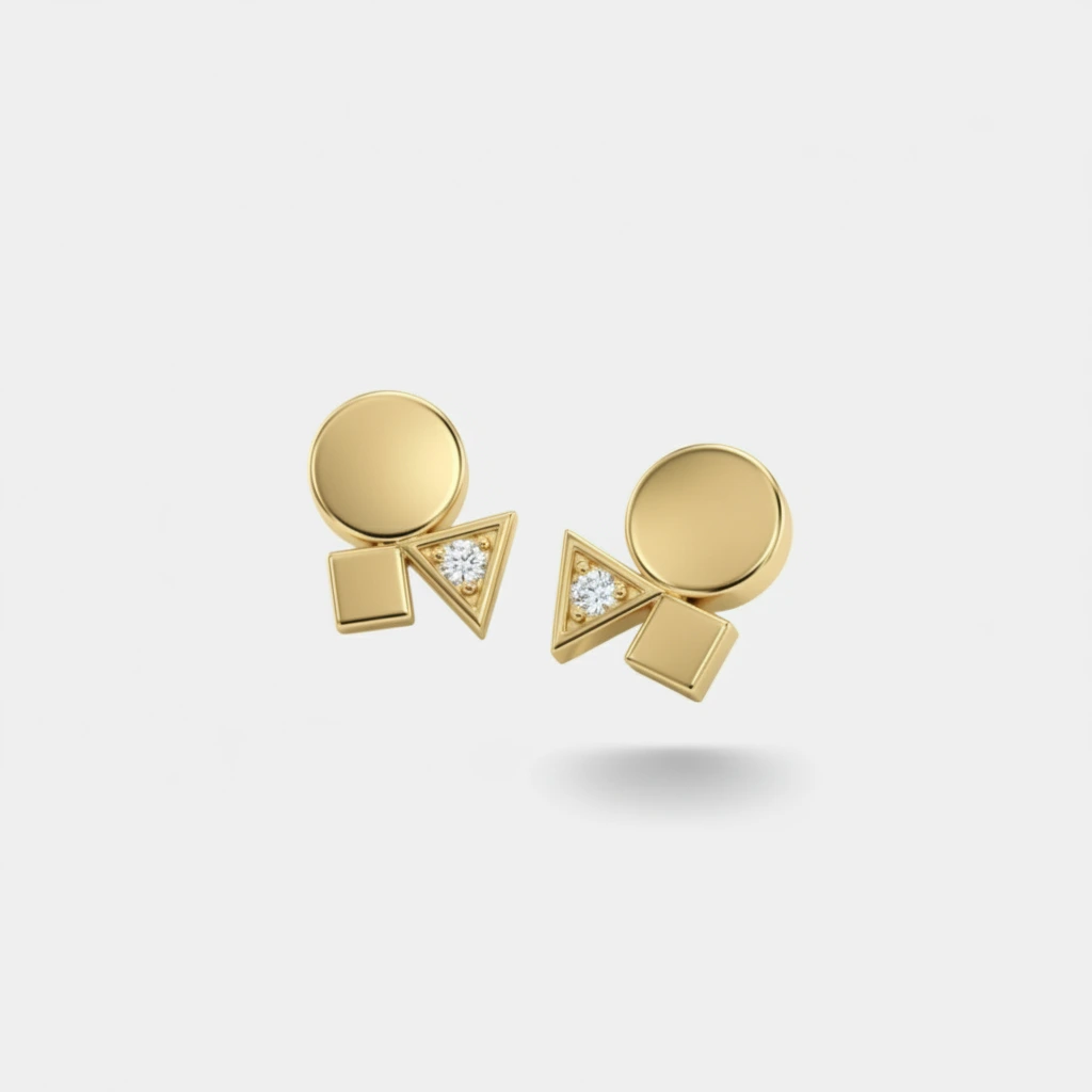 העגילים עשויים זהב 14K ומעוצבים כקומפוזיציה עדינה של צורות בסיס. במרכז המשולש משובץ יהלום עדין, היוצר ברק רך ומדויק ומוסיף שכבת אור מאוזנת למבנה כולו.