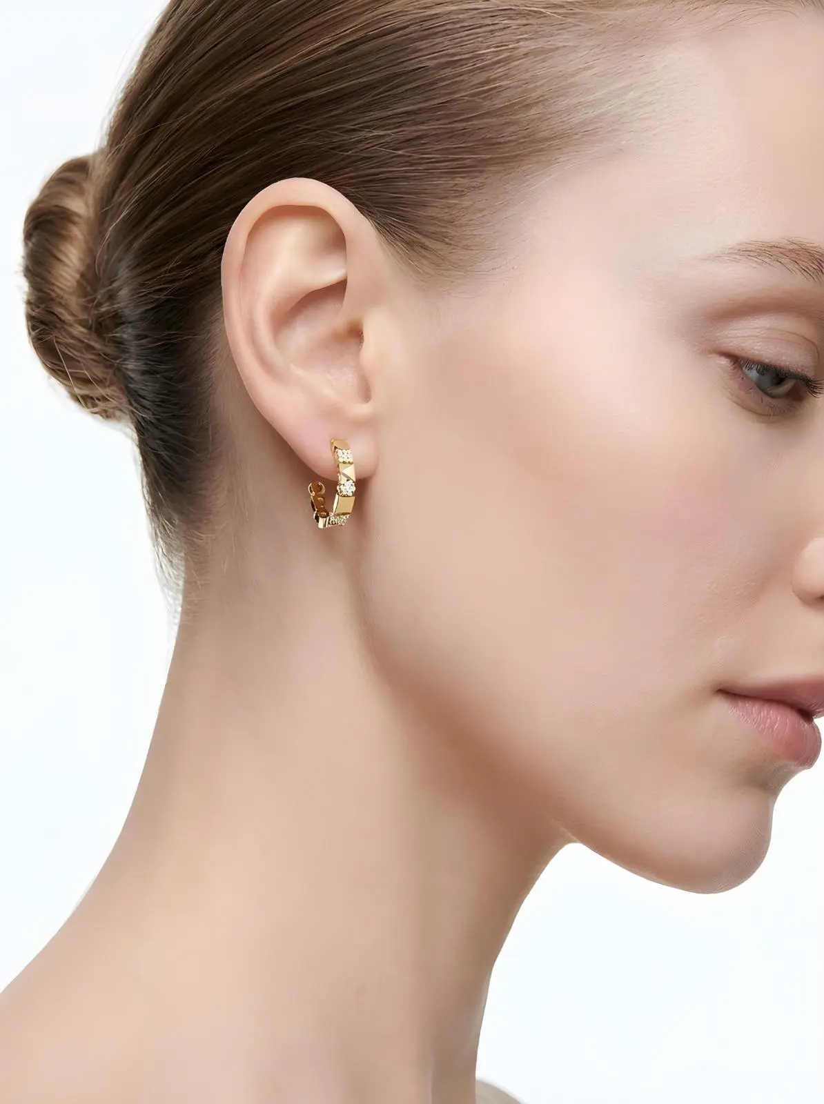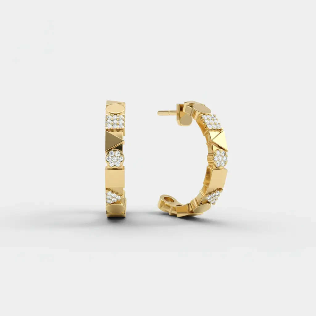 העגילים עשויים זהב 14K ומעוצבים כחישוק חצי קשיח המקיף את האוזן בתנועה הרמונית. בין האלמנטים משולבים שיבוצי יהלומים היוצרים נקודות אור מדויקות ומדגישים את המשחק בין הצורות.