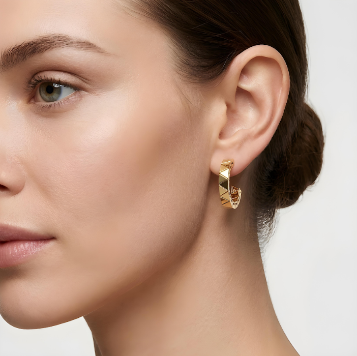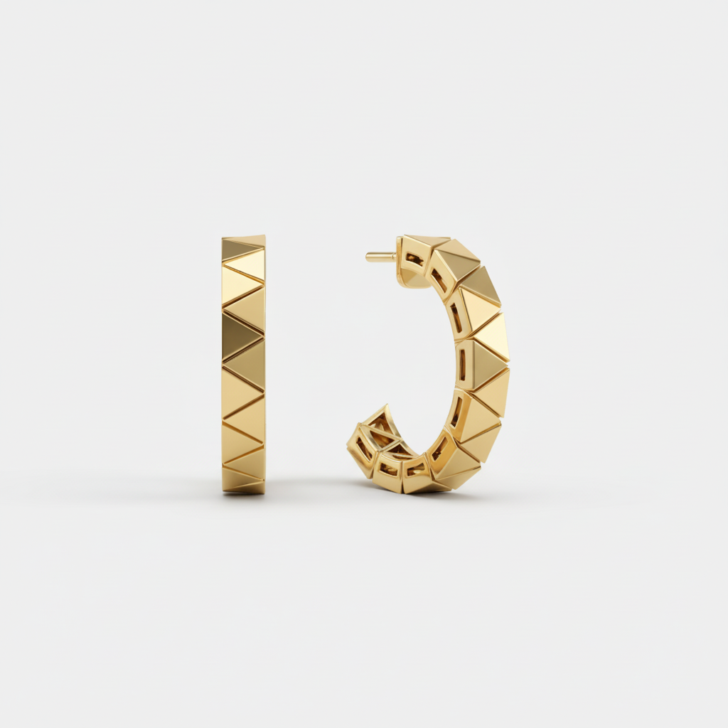 העגילים עשויים זהב 14K ומעוצבים כחישוק פתוח בעל נוכחות אלגנטית. לאורך הקשת מופיעה חזרה מדויקת של צורות גיאומטריות, היוצרות משחק עדין של אור, עומק ותנועה, ומעניקות לתכשיט מראה מודרני, ייחודי ועל זמני.