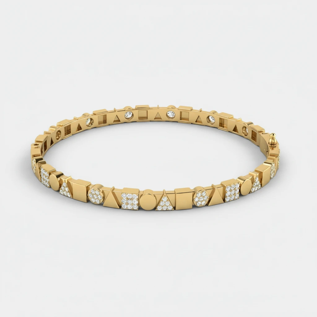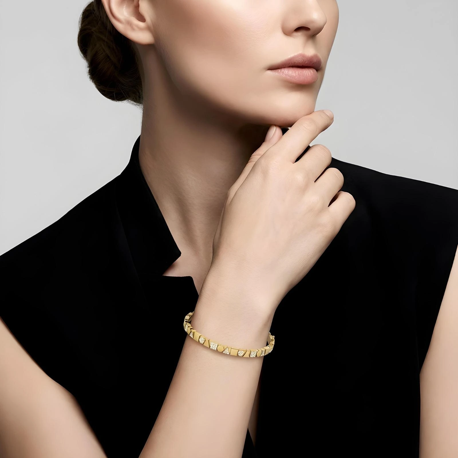 הצמיד עשוי זהב 14K ומשלב בין אלמנטים חלקים לבין יחידות משובצות יהלומים, היוצרות נקודות אור מדויקות לאורך המבנה. התוצאה היא תכשיט הרמוני שמאזן בין חומר, צורה ואור.