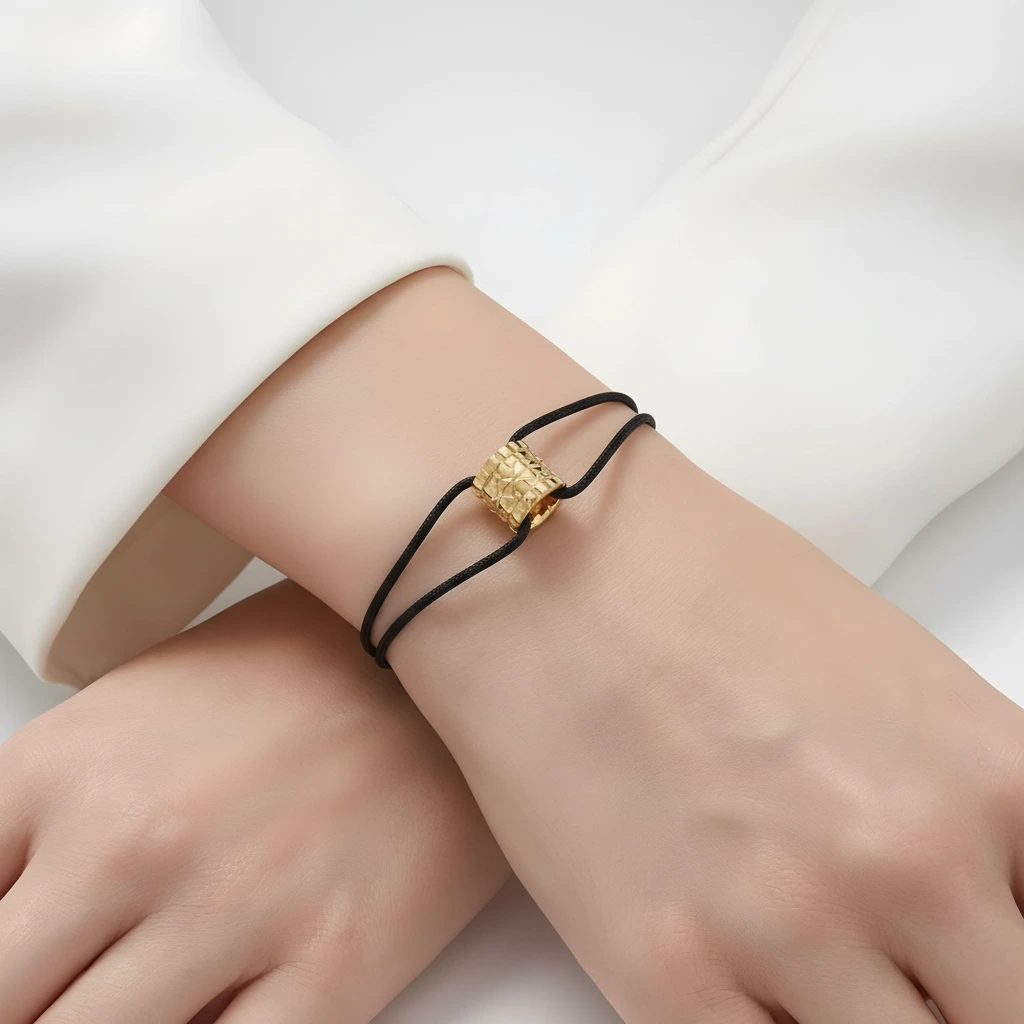 הצמיד עשוי זהב 14K ומשולב בחוט משי מתכוונן, המאפשר התאמה נוחה ומדויקת לפרק היד. העיצוב הנקי והקומפקטי הופך אותו לתכשיט יומיומי, כזה שניתן לענוד לבד או בשילוב עם תכשיטים נוספים.