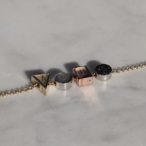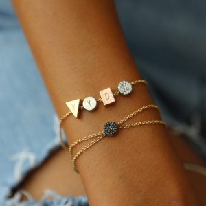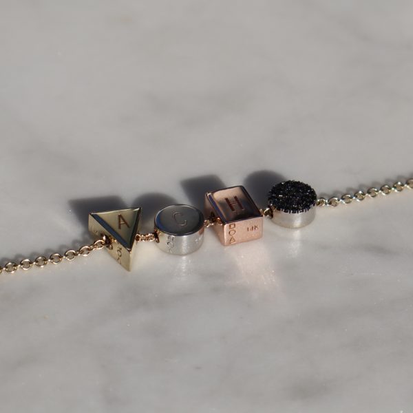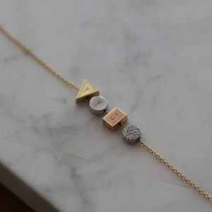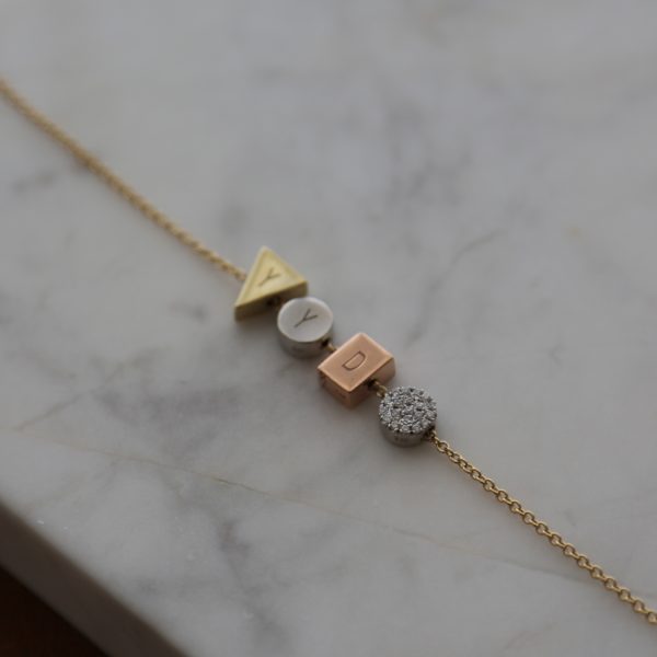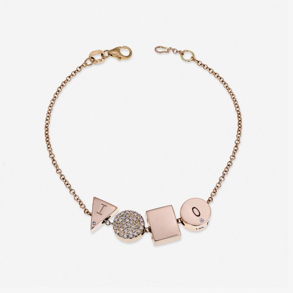 משקל תליון: 0.9-2.2 גר׳ בתמונה: צמיד דק זהב אדום + עיגול L עם חריטה ונקודת יהלום + מלבן L + עיגול L כיסוי מלא יהלומים + משולש S עם חריטה ונקודת יהלום